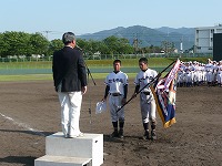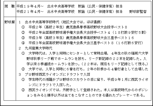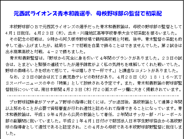 ![]() | 元西武ライオンズの選手だった本校野球部OBの青木和義教諭は,4月1日付けで本校野球部監督に就任しました。 MBCテレビは,青木和義監督をゲストに22日(月)午前10時「ズバかご」の中で,本校の国際交流室に設けられた特設スタジオから野球に対する抱負を6分間,生放送されました。 生中継は,鹿児島いずみテレビの椎木重治キャスタ−の司会,カメラは鹿児島いずみテレビの福崎一美カメラマンと本校のマルチメディア部員の手で動かされ,画面の切り替えはマルチメディア部員が担当しました。 青木和義新監督は番組の中で,「野球から完全に身を引いて4年間のブランクがありました。野球の素晴らしさを改めて感じて,母校で監督できる喜び,母校のグラウンドに帰った懐かしさ,母校には感謝の気持ちで一杯です。7月4日から始まる全国高校野球鹿児島県大会では,選手の持てる力を充分に発揮できるように采配をして,1戦1戦を大事に展開していきたい。将来はプロ野球に通用する選手も育てていきたい。」と静かな中にも闘志みなぎるコメントでした。 なお,本校は2回戦からの登場で7月11日(土)古仁屋高校と垂水高校の勝者と戦います。 |