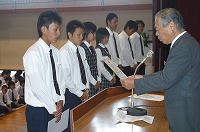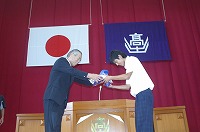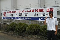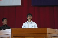 | 本校では,全国高校総体に出場する陸上部の尾上清文君の壮行会を7月17日(金),終業式に引き続いて体育館で盛大に行ないました。 陸上部の尾上清文君(教養課程3年生・米ノ津中学校卒業)は,男子400mで県高校総体で優勝,南九州高校総体で5位入賞で全国高校総体(インタ−ハイ)への出場となりました。 全国高校総体出場の壮行会は,先ず,松ヶ野学校長の激励のことばがあり,陸上部の玉目隆博顧問から予選の状況等,尾上君からは,今までの応援のお礼と全国大会の決意が力強く述べられました。そして,松ヶ野学校長は,県高校体育連盟から支給された帽子とTシャツを授与されました。 その後,玉目顧問を先頭に尾上君は,吹奏楽の演奏する軽快な曲「世界に一つだけの花」に乗り,体育館中央部を通り,全校職員・生徒の皆さんから大きな拍手をいただき元気よく全国高校総体に向けて体育館を退場して行きました。 陸上部の黒田安名監督は,「尾上君は,激戦を勝ち抜いての全国高校総体出場を大変嬉しく思います。全国の高校生と真夏の暑さに負けない根性で,技を競いベストを尽くして頑張ってほしいものです。」との激励のコメントがありました。 なお,平成21年度全国高校総体陸上競技大会(秩父宮賜杯第62回全国高等学校陸上競技対校選手権大会)は,下記のとおり行われます。 1 出場者:尾上清文(男子400m)(教養課程3年生・米ノ津中学校卒業) (男子400m:予選から決勝まで初日の7月29日に行われます。) 2 大会名:平成21年度全国高校総体陸上競技大会(インタ−ハイ) (秩父宮賜杯第62回全国高等学校陸上競技対抗選手権大会) 3 期 日:7月29日(水)〜8月2日(日) 男子400m:7月29日(水) 4 場 所:奈良市鴻ノ池陸上競技場 | ||