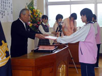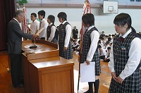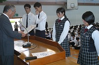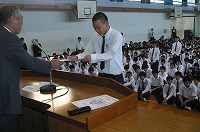 | 本校の平成21年度生徒会役員は,9月25日(金)に立会演説会・選挙を行い,下記のように16名の新役員が決定しました。 9月30日(水)午後1時から職員会議室で行われた任命式で,松ヶ野正弘校長から新生徒会長小田竣也君をはじめ新役員全員に任命状が直接交付されました。 任命式は,生徒会係長の池袋之弘教諭の司会で進められ,校長・教頭・教務部長・生徒指導部長・生徒会係職員3名の計8名の列席のもと,厳粛に執り行われました。 任命状を交付された後,松ヶ野校長は,「16名の新生徒会役員の就任おめでとうございます。学校は生徒会活動なくして素敵な学校生活は展開できません。文化祭や体育祭などに必死に頑張っていた今までの役員の姿を引き継ぎながら,小田会長を中心として頑張ってください。」と激励されました。前生徒会長の前田和人君は,「日本の新政権誕生の記念の時の生徒会役員就任です。思い込めて本校発展のためにベストを尽くしてください。」とエールを送りました。新生徒会長の小田竣也君は「16名の新役員の全員のコミニュケーションを大事にしながら,出水中央高校の発展のために努力していきます。」と力強く決意を述べました。 新生徒会役員は,任期が10月1日から来年の9月30日までの1年間ですので,1・2生が選ばれました。会長の小田竣也君を中心に全員が協力して素晴らしい生徒会を運営するものと思われます。どうぞ新役員に御声援ください。そして,御期待ください。 平成21年度新生徒会役員(任期:平成21年10月1日〜平成22年9月30日) ![]() 注 普通課程・教養課程・特進課程は,全て普通科です。看護学科は,看護学科基礎課程です。 ![]() | ||