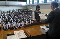 | 本校では,創立60周年記念第48回体育祭で入賞した団体・個人の表彰を9月8日(火),体育館の全体朝礼で行いました。 体育祭当日の閉会式の表彰は,炎天下の暑さと生徒の皆さんの疲労等を考慮して,競技の部の表彰,応援の部の表彰と新記録者へ賞状等授与の最小限に留めていました。 8日(火)の全体朝礼の表彰式は,団体・個人入賞者の全員に松ヶ野正弘校長から直接,授与されました。 各種目ごとの賞状の授与後,全員の拍手と吹奏楽部の演奏する「得賞歌」でも健闘を称えられ,受賞者は感動を新たにしていました。 松ヶ野正弘校長は,「入賞した皆さんおめでとうございます。心から健闘を称えます。体育祭は,全ての皆さんの真剣で真面目な取り組みで素晴らしい評価を得ました。創立60周年記念の華もグラウンド一杯に咲きました。本年度の本校の4大行事で3つが終了,皆さんの努力と先生方の指導で順調に展開していて大変嬉しく思います。これからの本校の展開が大変楽しみになってきました。16日から始る就職試験を皮切りに3年生(看護学科基礎課程3年生は除く)と専門課程2年生は,身近に大切な時が迫ってきます。目標に向かって頑張ってください。また,来春,卒業・修了でない皆さんも,充実の高校生活を送りましょう。」と激励されました。 なお,入賞の団体・個人の詳細の氏名等は,前掲のHPの「第48回体育祭,あの感動・感激をこれからの学校生活へ」の中に全部掲載してあります。 | ||