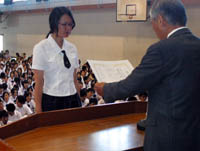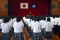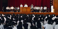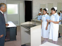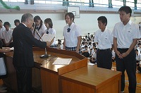 | 本校の1学期の終業式は,本日(17日・金)午前10時35分から体育館で,臨地実習中の看護学科専門課程2年生・基礎課程2年生を除く全校生徒と職員が参加して行われました。 松ヶ野校長は,式辞で「今年度の始業式・入学式では『四つ願い』を取り上げて皆さんを激励してきました。@学習が理解できる人になってください。A自分の良さを伸ばしてください。B小さなことでも続けてください。継続は力です。C天才は有限ですが,努力は無限です。努力する人になってください。その激励に応えて多くの成果が,1学期の学業・生活態度・学校行事・部活動・進路等の5つの柱によく反映されており大変嬉しく思います。これからの長期の夏休み・今後の学校生活でも,『四つ願い』の実現に向けて努力してください。長期の夏休みをリズミカルな生活で身体を大事にして身体を鍛えたくましく成長しましょう。そして,夏休みは,身体にも充分気を付けて,8月31日(月)(平成22年1月8日振替)の2学期の始業式は全員元気で登校してください。」と生徒一人一人に話しかけられました。 その後,全員で校歌を斉唱し,真夏日の中の体育館での終業式を終わりました。終業式の後,井生徒指導部長から「夏季休業中の生活心得」についての話がありました。 なお,看護学科専門課程2年生は10週間にわたる臨地実習を終えた本日午後5時から合同講義室で専門課程の職員参列の中,終業式を行いました。(写真右:藏元看護学科部長) また,体育館看護学科基礎課程2年生の終業式は,施設実習終了の7月24日(金)に行います。 | ||