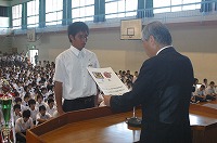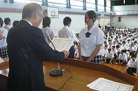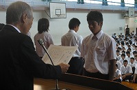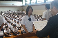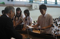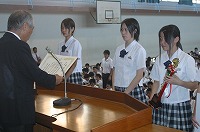 | 本校では,7月9日(木)に実施のクラスマッチの表彰式を17日(金)の終業式の後の午前10時から体育館で行いました。 表彰式では,各クラスの代表者に直接,松ヶ野学校長から表彰状が手渡され,各クラスの代表者は全員笑顔で受け取っていました。吹奏楽部の演奏する『得賞歌』で一段と華を添えました。臨地実習中の看護学科基礎課程2年生は,後日渡されます。 今年度のクラスマッチは,バスケットボール(男・女),バレーボール(男・女),サッカー(男子),ソフトボール(女子),ドッジボール(女子)の5種目・延べ7種目を7月9日(木)に行いました。