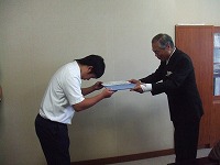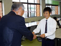 | 本校教養課程の有村桂君は,アイルランド留学から帰国,留学の単位が認定され,8月25日(火)午後2時から校長室で卒業式を行いました。 有村君は,平成20年4月からアイルランドの語学学校に通い,9月からポバルスコイル・ロスミニ高校に留学していました。1年間の留学を終えて帰国,8月25日付けの本校卒業となりました。 卒業式は,波留教務部長の司会で進行し,卒業証書授与,松ヶ野校長式辞,木山教養課程主任等参列者の全ての先生方からお祝いの言葉がありました。そして,保護者の挨拶があり,式は終了しました。留学で得たものを今後の生活に活かして頑張ってほしいと思います。 本校では,国際理解教育に積極的に取り組み,留学生として送り出したり,受け入れたりしています。現在,オーストラリアからの留学生を受け入れています。国際理解教育は,特に,教養課程で積極的に取り組んでいます。 国際理解教育につきましては,ここからアクセスして御覧ください。 | |