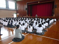 | 本校の看護学科基礎課程3年生85名は,9月11日(金)の午後3時50分から4時30分まで視聴覚室で臨地実習開始式を下記要項で行いました。 開始式には,3年生全員がナースの実習服を着用し,緊張の面持ちのなか誠に凛々しい姿で臨んでいました。司会進行は,3年2組学級担任の才木玲子先生が担当されました。 先ず,松ヶ野正弘学校長あいさつでは,気力,気概,気転,・・・,気品など『気』の付くことばを8つ取り上げて激励されました。つづいて,生徒指導部の井英樹部長は,実習中の生活態度等について注意されました。そして,看護学科藏元重親部長は,部長として実習を行う85名の皆さんが,全員元気良く実習を行い,大きな収穫を持って成長してほしいと激励されました。 最後に,田中美穂(1組)さん・熊部穂名美(2組)さんが生徒代表の誓いのことばを述べました。「今回は2年生の時より一歩進んだ実習が求められます。看護に必要な知識・技術・態度のすべてが成人・老人実習としてより広く,深い学びある実習にならなくてはいけません。そのためには,対象の特徴,個別性をとらえた看護を行っていく必要があります。それは決して簡単なことではなく,沢山の悩みが生まれることかも知れません。自分たちの力のなさにもどかしこさを感じることもあるはずです。そんな時,ピンチだとは思わず,自分に与えられたチャンスだと思えるように全力を尽くして頑張ります。実習は一人でできるものではありません。支え合える仲間がいて力を貸してくださる先生方,家族があってこそ達成できるのだと思います。そのことをいつも胸に多くの学びが得られる実習にしたいと思います。」と力強く述べました。 実習生は,昨年の2年生時の戴帽式の後,4週間の臨地実習を終えていますので,臨地実習に対するある程度の心構えはできていますが,開始式には緊張で真剣な態度で臨んでいました。 「実習生 がんばれ!」 1 日 時 9月11日(金) 午後3時50分から4時30分 2 場 所 視聴覚室 3 出席者 看護学科基礎課程3年生85名 4 式 順 (1)学校長あいさつ(松ヶ野正弘校長) (2)生徒指導部長から諸注意(井英樹部長) (3)看護学科部長激励のことば(藏元重親部長) (4)生徒代表誓いのことば(田中美穂さん・熊部穂名美さん) 5 実習先 8箇所 6 司 会 才木玲子(3年2組学級担任) | ||